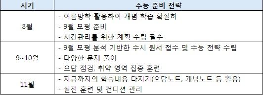9월 모의평가(9월 3일) 전 기간이자 여름방학이 포함된 기간이므로 최대한 학습량을 늘려야 한다. 이 때, 수능이 얼마 남지 않았다고 해서 기출문제 위주로만 공부하려는 것은 바람직하지 않다. 하위권은 물론, 최상위권 학생이라 하더라도 개념 정리는 필수이다. 취약과목을 중심으로 주요 개념을 다시 한 번 숙지하고, 공부하면서 틀리는 문제에 해당하는 개념은 특별히 신경써서 정리해 두어야 한다.