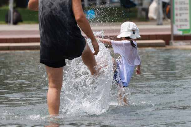 무더위가 이어진 2일 서울 영등포구 여의도물빛광장을 찾은 시민들이 물놀이하고 있다.(사진=연합뉴스) |