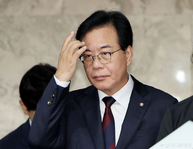 [서울=뉴시스] 김명년 기자 = 송언석 국민의힘 비대책위원장 겸 원내대표가 5일 오전 서울 여의도 국회에서 열린 '반 기업법(상법, 노란봉투법) 문제점과 향후 대응 긴급 간담회'에서 입장하고 있다. 2025.08.05. kmn@newsis.com /사진=김명년