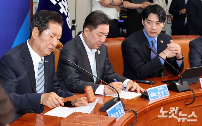 더불어민주당 정청래 신임 대표가 국회에서 열린 최고위원회의에서 의사봉을 두드리고 있다. 박종민 기자 |