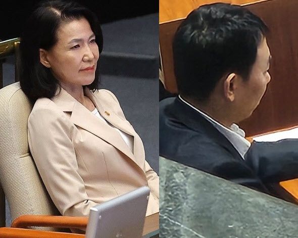 5일 국회 본회의에서 방송법 일부개정법률안 관련 무제한 토론(필리버스터)을 이어가는 가운데, 이진숙 방송통신위원장과 김용민 더불어민주당 의원이 포착됐다.(사진=연합뉴스, 뉴스1) |