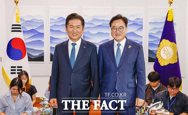 정청래(왼쪽) 더불어민주당 신임 대표가 5일 오전 서울 여의도 국회에서 우원식 국회의장을 예방해 기념촬영을 하고 있다. /국회=박헌우 기자