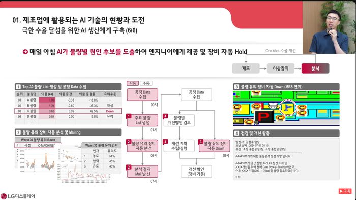 이영주 LG디스플레이 제조AI실장이 AI생산체계를 도입해 AI가 불량을 개선하고 수율을 향상시키는 원리를 설명하고 있다. 〈사진 LG디스플레이 유튜브 캡쳐〉 |
