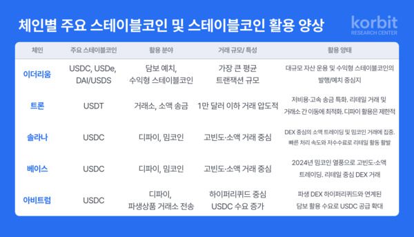 [CBC뉴스] 국내 최초 가상자산 거래소 코빗의 리서치센터가 최근 발표한 보고서에서 스테이블코인의 온체인 경제 내 역할을 심층 분석했다. 이 보고서는 스테이블코인이 자산별로 다양한 기능을 수행하고 있으며, 블록체인별 경제 구조의 분화가 뚜렷해지고 있음을 강조했다. 보고서에 따르면, 대표적인 법정화폐 담보형 스테이블코인인 USDT는 트론 기반 송금 및 중앙화 거래소 간 정산 수단으로 주로 활용되고 있다. 반면, USDC는 이더리움, 솔라나, 아비트럼 등에서 디파이 담보 및 거래 자산으로 쓰이며, 가상자산 담보형 스테이블코인인 USDe와 USDS/DAI는 디파이 내에서 예치, 대출, 수익 배분 자산으로 기능한다. 코빗 리서치센터는 스테이블코인의 활용이 체인의 특성에 따라 뚜렷하게 달라진다고 분석했다. 이더리움은 높은 보안성과 자금 규모를 바탕으로 디파이 담보 자산 중심의 활용이 두드러지고 있으며, 트론은 저수수료와 고속 전송을 기반으로 송금 및 결제에 특화되어 있다. 이러한 각 체인의 경제 구조와 맞물려 기능별 인프라 자산으로 진화하고 있다는 것이다. 보고서는 스테이블코인 시장이 단일 수요나 기능 중심의 일원적 구조가 아닌, 사용처, 수익 구조, 체인 인프라 세 가지 축을 중심으로 분화되고 있다고 진단했다. 코빗 리서치센터의 강동현 연구위원은 "현재 스테이블코인은 실물경제보다 온체인 경제 및 가상자산 시장에서의 활용이 압도적으로 많다"며 "온체인 금융 인프라, 수익 추구형 자산, 실물경제 결제 등으로의 분화는 향후 가상자산 생태계 전반의 기회와 리스크를 동시에 확대시킬 것"이라고 전망했다.