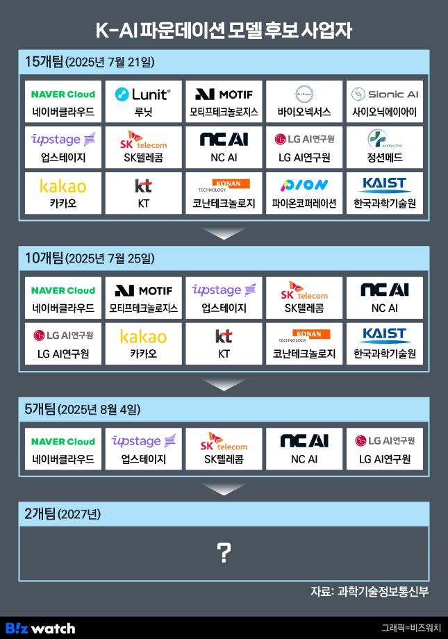5일 업계에 따르면 정부는 '독자 AI 파운데이션 모델 프로젝트' 수행팀으로 네이버클라우드, LG AI 연구원, SK텔레콤, NC AI, 업스테이지 컨소시엄 등 5곳을 선정했다. 이 과정에서 유력 후보로 꼽혔던 KT와 카카오는 탈락했다.