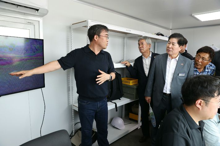 공영민 군수가 5일 드론배송센터 관제실에서 시스템 모니터를 통해 드론 배송 시연 영상을 확인하고 있다. 고흥군 제공 |