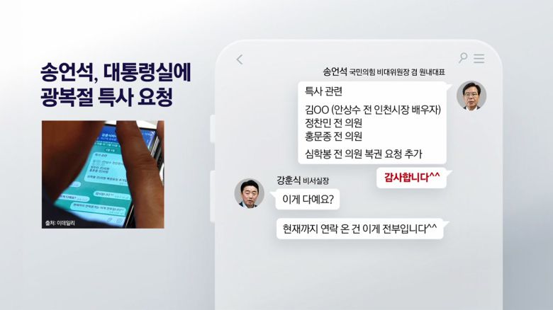 송 원내대표가 강훈식 대통령 비서실장에게 '특사 관련'이라며, 안상수 전 인천시장 부인 김 모 씨와 정찬민, 홍문종, 심학봉 전 의원에 대한 사면과 복권을 요청하는 메시지를 보내는 장면이 공개됐습니다.