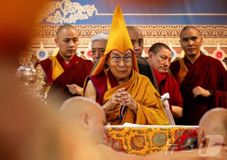 달라이 라마가 30일(현지 시간) 인도 다람살라 북부 맥레오드 간즈에 위치한 티베트 사원에서 열린 자신의 90세 생일 기념 장수 기도식에 참석하고 있다. 2025.06.30 ⓒ AFP=뉴스1 ⓒ AFP=뉴스1 ⓒ News1 윤다정 기자