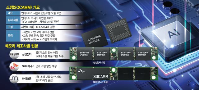국내 메모리반도체를 대표하는 삼성전자(005930)와 SK하이닉스(000660)가 고대역폭메모리(HBM)에 이어 차세대 D램 모듈 규격인 소캠(SOCAMM) 시장 선점을 위한 양산 경쟁에 돌입했다. 인공지능(AI) 칩 세계 1위인 엔비디아가 독자 표준으로 채택해 ‘제2의 HBM’으로 떠오른 이 시장에서 초기 주도권을 놓치지 않기 위해서다. 미국 마이크론이 소캠 시장에서 선두 주자를 표방하자 삼성전자와 SK하이닉스도 나란히 연내 양산을 공식화해 판도 변화가 주목된다.