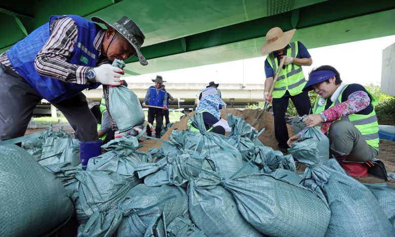 6일 전국 대부분 지역에 천둥·번개를 동반한 매우 강한 비가 내릴 것으로 예보된 가운데 5일 광주 북구 동림동 산동교친수공원 주차장에서 작업자들이 침수 예방을 위한 모래주머니를 만들고 있다. 광주=연합뉴스 |