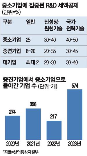 이런 이유로 중견기업이 됐다가 다시 중소기업으로 돌아가는 기업이 2020년 274개에서 2023년 574개로 증가했다. 지인엽 동국대 경제학과 교수는 "실증 분석 결과 자산총액 5000억원, 2조원과 같이 규제 적용 기준 부근에서 기업 규모가 정체되는 현상이 관찰됐다"며 "차등 규제가 건전한 시장 규율 역할보다 오히려 우리 기업의 성장을 제한할 수 있음을 시사한다"고 말했다. 오픈AI와 같은 슈퍼스타 기업을 한국에서 찾아볼 수 없는 이유 중 하나도 기업 규모가 커질수록 정부 지원은 줄고 성장을 가로막는 규제는 늘어나기 때문이다. 김영주 부산대 무역학부 교수는 "자산별 차등 규제는 성장 가능성이 높은 핵심 소부장(소재·부품·장비) 산업과 미래 산업 분야의 중견기업들이 글로벌 규모로 성장할 수 있는 동기를 희석시키는 원인으로 작동한다"고 지적했다.