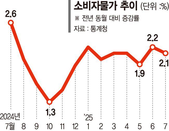 민생회복 소비쿠폰이 풀린 7월 소비자물가는 1년 전과 비교해 2.1% 상승했다. 수산물 가격이 가파르게 오르고 가공식품 역시 높은 상승세를 이어갔다.