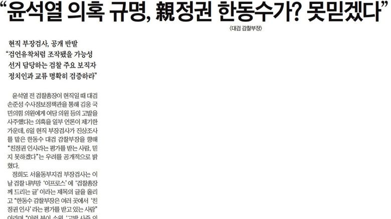 조선일보는 고발사주 사건을 본격적으로 보도하면서, 첫 기사로 <"윤석열 의혹 규명, 親정권 한동수가? 못믿겠다">(2021.9.7.)를 실었다. 서울동부지검의 한 부장검사가 검찰 내부망에 “친정권 인사라는 평가를 받는 사람, 믿지 못하겠다”는 취지로 올린 글을 받아 쓴 기사다.