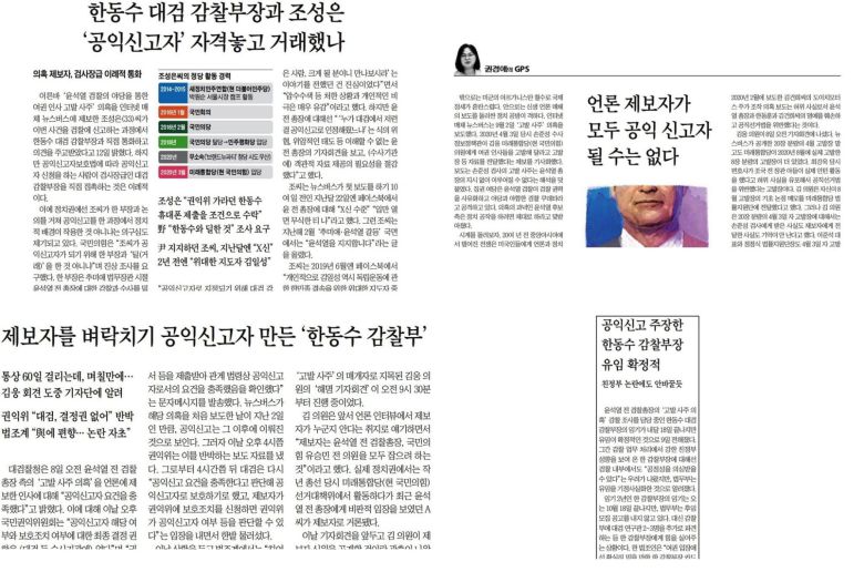 곧이어 제보자 조성은 씨에 대한 ‘공익신고자 자격 시비’가 나왔다. 제보자 조 씨가 ‘공익신고자 요건을 충족했다’는 대검 감찰부 판단을 문제삼았다. 조선일보는 <'고발사주 의혹' 제보자를 벼락치기 공익신고자 만든 '한동수 감찰부'>(2021.9.9.)에서 대검이 ‘월권’했다고 주장했다.