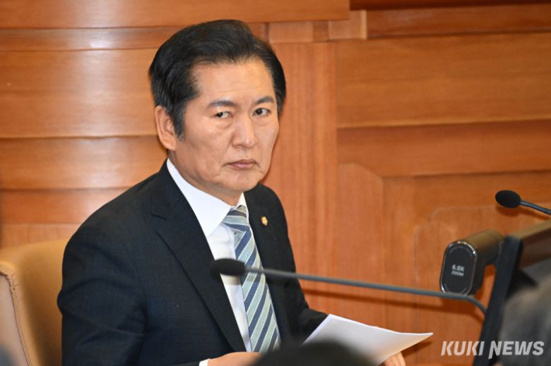 정청래 법제사법위원장이 25일 서울 종로구 헌법재판소 대심판정에서 열린 윤석열 대통령 탄핵심판 최종 변론에 출석하고 있다. 쿠키뉴스 자료사진 |