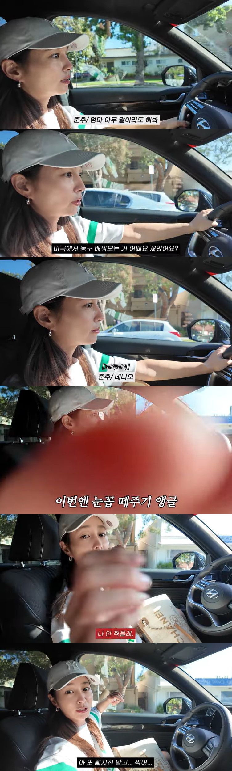 운전하는 이민정의 옆에서 카메라를 가져간 준후는 "엄마 아무 말이라도 해봐"라고 말했고, 이에 이민정은 "미국에 와서 어떠냐. 시차 다 맞췄냐"고 물었다.