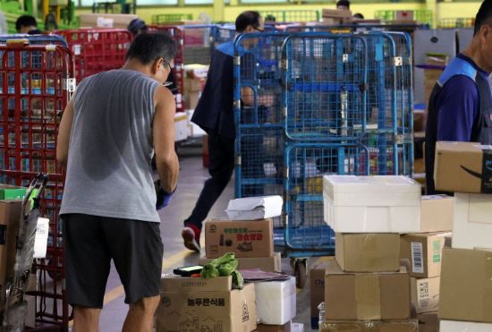 한 택배작업자가 폭염의 날씨로 상의가 땀에 흠뻑 젖은 상태로 우체국 택배 등 분류 배송 작업을 하고 있다. 사진은 기사의 특정 내용과 관련 없음. 조용준 기자. |