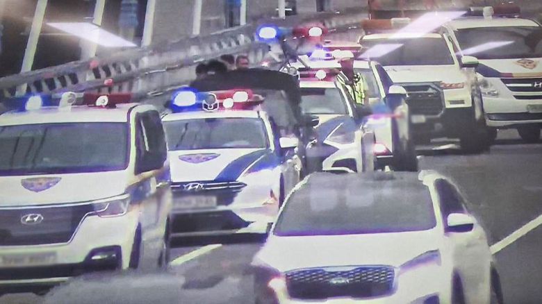 다리 위에 순찰차가 줄지어 서 있고 가운데 멈춰 선 검정 승용차를 경찰이 수색합니다.