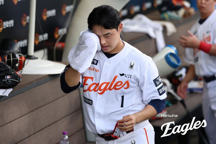 더그아웃에서 문동주가 땀을 닦고 있다. 사진 | 한화 이글스 |