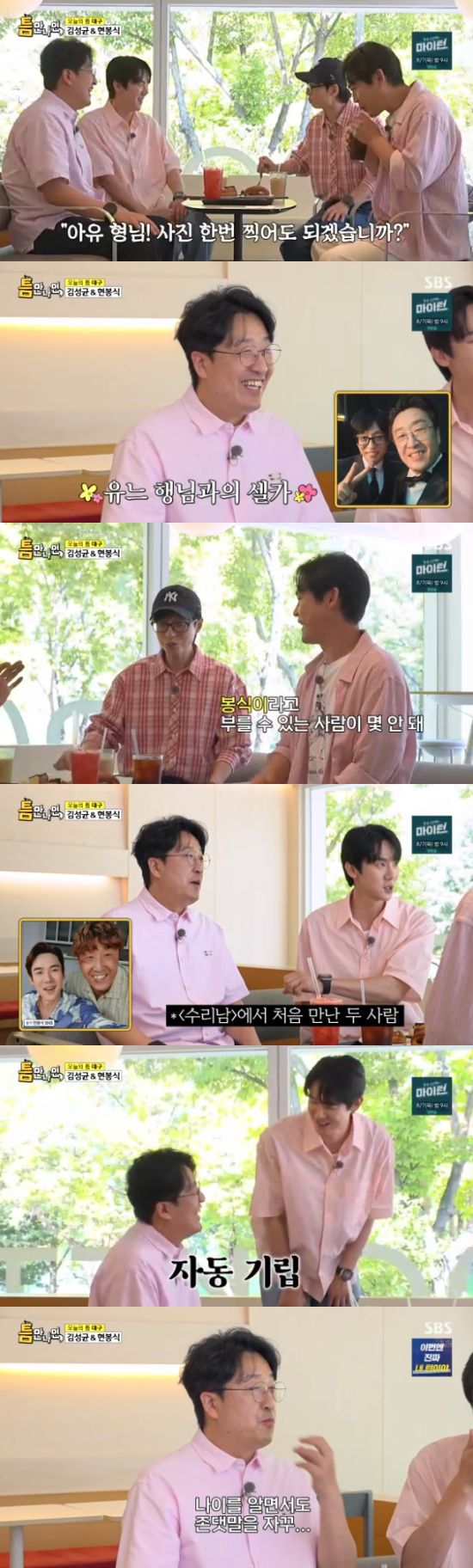 두 사람이 이야기를 나누던 중 오늘의 '틈 친구' 김성균과 현봉식이 등장했다. 유재석은 "봉식이 이제 보네~봉식이랑은 '백상예대상'에서 봤다. 다음에 한 번 보자고 했는데 이제 보네"라고 환영했다.
