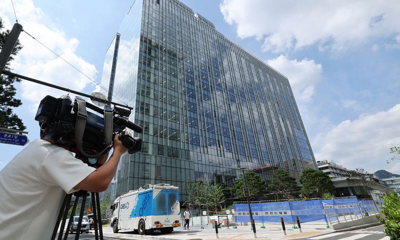 金, 특검 개시 후 첫 소환 김건희씨의 특검 소환조사를 하루 앞둔 5일 서울 종로구 김건희 특검팀(특별검사 민중기) 사무실 앞에서 한 방송사 기자가 취재를 하고 있다. 남정탁 기자 |