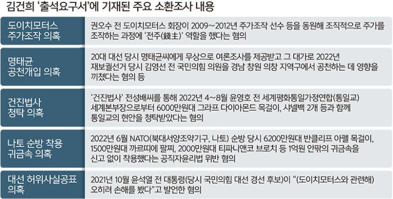 이 밖에도 김씨가 2022년 6월 북대서양조약기구(NATO·나토) 순방 당시 6200만원대 반클리프 아펠 목걸이 등 고가의 장신구를 공직자윤리법에 따른 재산신고 없이 착용했다는 의혹과 윤 전 대통령이 2021년 10월 국민의힘 대선 경선 후보 신분으로 “(도이치모터스와 관련해) 오히려 손해를 봤다”고 발언해 허위사실을 공표한 혐의 등도 조사할 가능성이 점쳐진다.