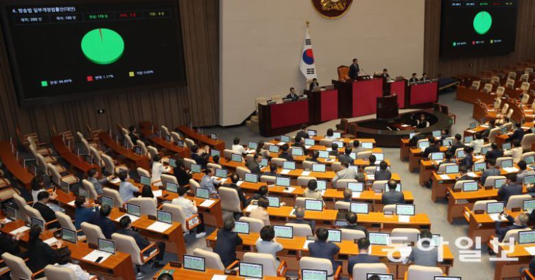 5일 국회 본회의에서 방송법 개정안이 재석 180명 중 찬성 178명, 반대 2명으로 통과되고 있다. 국민의힘은 강행 처리에 반발하며 표결에 불참했다. 장승윤 기자 tomato99@donga.com