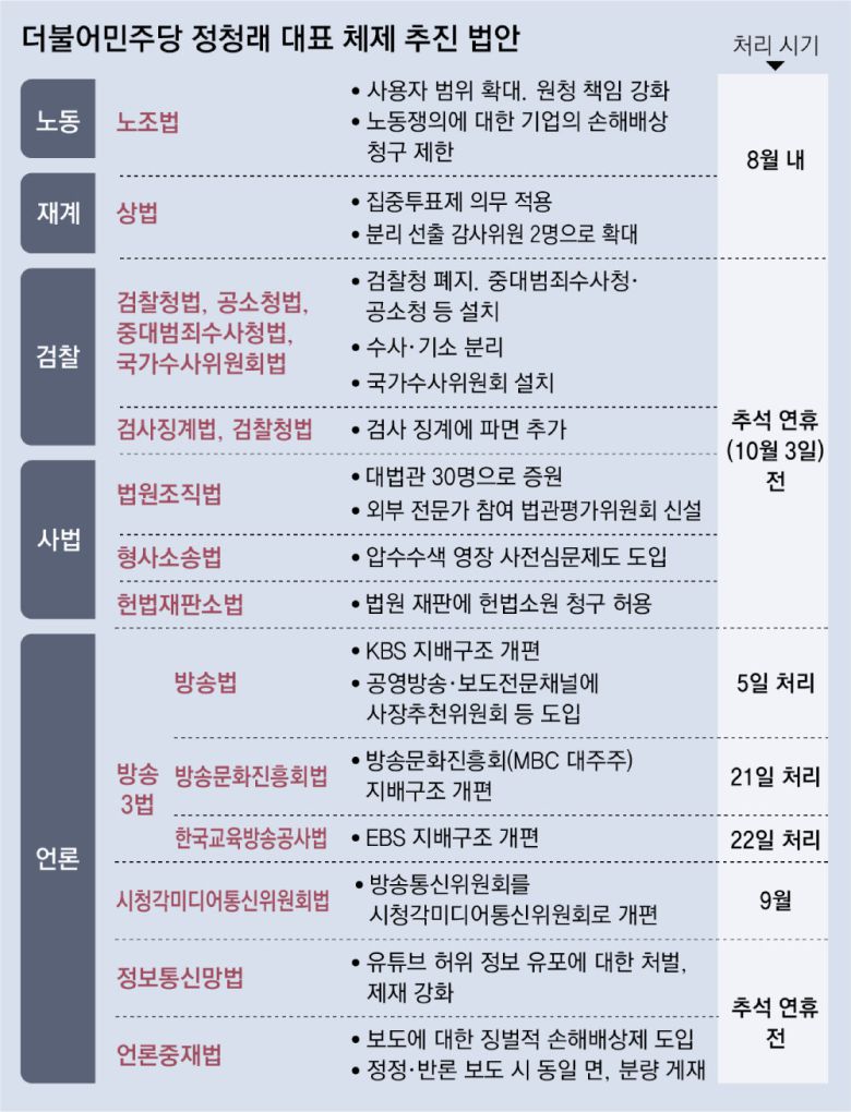 더불어민주당 정청래 대표가 취임하자마자 국회에 ‘입법 폭풍’이 몰아치고 있다. “이재명 정부와 원팀”을 강조하는 정 대표의 민주당은 5일 방송법 통과를 시작으로 이달 중 노란봉투법 등 4개 법안을 일방 처리하고, 추석 연휴 전까지 검찰·사법·언론 등 3대 법안까지 통과시키겠다는 방침이다.