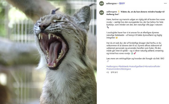 [뉴시스] 덴마크의 한 동물원이 수명이 얼마 남지 않은 반려동물을 육식 동물의 먹이로 기증해달라고 요청해 논란이 일고 있다. (사진=올보르 동물원 인스타그램 캡처) 2025.08.05 *재판매 및 DB 금지 |