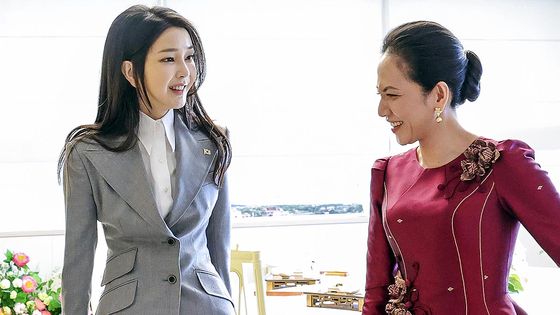 윤석열 전 대통령 부인 김건희 여사가 지난해 5월 16일 용산 대통령실 청사에서 열린 한-캄보디아 정상회담에 앞서 뺏 짠모니(Pich Chanmony) 캄보디아 총리 배우자와 환담 후 이동하며 각 나라의 전통의상에 대해 이야기를 나누고 있다. 김 여사가 공식 석상에 등장한 것은 2023년 12월 윤 대통령의 네덜란드 국빈 방문 귀국 행사 후 153일 만이었다. 중앙포토 |