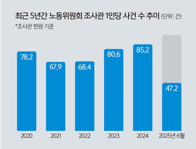 5일 중앙노동위원회(중노위) 자료에 따르면 올 상반기 중노위와 12개 지노위에 접수된 사건 수(심판·조정)는 총 1만3455건으로 집계됐다. 단순 계산해 한 해 접수 건수로 환산해보면 5년 전인 2020년(1만8924건) 대비 42.2% 늘었단 계산이 나온다. 조사관 인원이 사건 접수량 증가세를 따라가지 못하면서 1인당 사건 수 또한 2021년 67.9건에 이어 2022년 68.4건, 2023년 80.6건, 지난해 85.2건으로 3년 연속 증가세를 보이는 중이다. 올 상반기도 47.2건으로 집계돼 사실상 4년 연속 증가세를 그릴 가능성이 높은 상황이다.