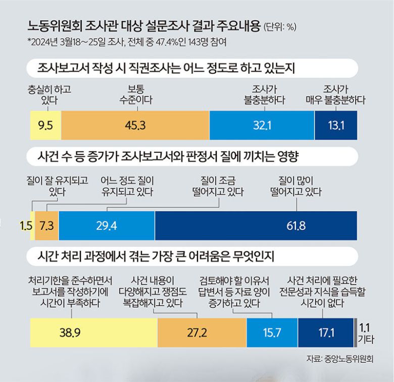 실제 지난해 3월 조사관 대상으로 진행한 설문조사에서도 응답자 10명 중 9명 이상(91.2%)이 사건 수 등 증가가 조사보고서와 판정서 질에 부정적 영향을 끼친다고 답했다. 조사관 업무만 7년 넘게 해오고 있는 다른 관계자 B씨는 “사건을 진행하다 보면 서면이나 증거가 불충분한 경우가 있는데 직권조사를 통해 보완하는 경우가 있다”며 “노동위 차원에서 판정 정확성을 제고하기 위해 직권조사를 활성화하자는 기조를 갖고 있지만 현장에선 정해진 기한 내 사건을 처리하는 데 허덕이다 보니 직권조사에 소극적인 측면도 있다”고 했다. 노동위 사건은 접수일로부터 60일 이내에 심문회의를 개최해야 한다. 실제 설문조사에서 조사보고서 작성 시 직권조사를 어느 정도 하고 있냐는 질문에 응답자 45.2%(불충분 32.1%·매우 불충분 13.1%)가 불충분하다고 답했다.
