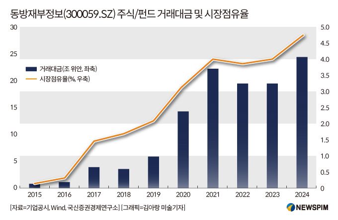 2024년 기준 주식과 펀드 거래대금은 24조2400억 위안을 기록했으며 시장점유율은 4.71%로 전년 동기 대비 0.7%포인트 늘었다.