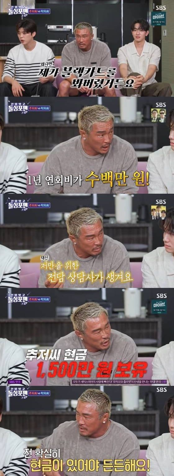 추성훈은 현재 지갑에 현금이 얼마 있냐는 질문에 “여기 오기 전에 쓸 일이 있어서 정확하게 알고 있다. 지금 1500만원 정도”라고 밝혔다. 이에 김준호는 과거 추성훈과 오사카 여행했던 때를 회상하며 “우리는 현금 100만원 정도를 갖고 갔는데, 추성훈은 3000만원을 갖고 왔더라”고 인증했다.
