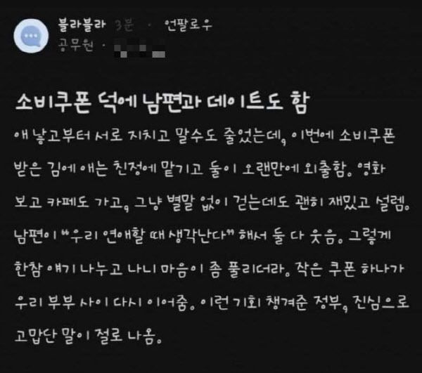 A씨는 ‘소비쿠폰 덕에 남편과 데이트 함’이라는 글에서는 “아이 낳고부터 서로 지치고 대화도 줄었는데 소비쿠폰 받은 김에 아이 친정에 맡기고 오랜만에 둘이 외출했다”면서 “영화 보고 카페도 가고 별 말 없이 걷는데도 괜히 재밌고 설렜다. 남편이 ‘우리 연애할 때 생각난다’해서 둘 다 웃었다. 그렇게 한참 얘기 나누고 나니 마음이 풀리더라. 작은 쿠폰 하나가 우리 부부 사이 다시 이어줬다”고 감사를 표했다.