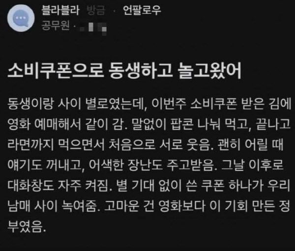 또 A씨는 ‘소비쿠폰으로 동생하고 놀고 왔음’이라는 글에서는 “동생이랑 사이 별로였는데 소비쿠폰 받은 김에 영화 예매해서 같이 갔다. 말없이 팝콘 나눠 먹고 끝나고 라면 먹으면서 처음으로 서로 웃었다”면서 “어릴 때 얘기도 꺼내고 장난도 주고받다가 그날 이후로 대화도 자주 하게 됐다. 별 기대 없이 쓴 쿠폰 하나가 우리 남매 사이 녹여줬다. 고마운 건 영화보다 이 기회 만든 정부였다”고 썼다.