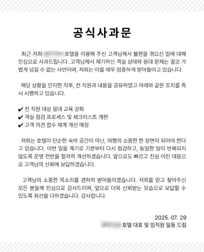 그러면서 △전 직원 대상 응대 교육 강화 △객실 점검 프로세스 및 체크리스트 개편 △고객 의견 접수 체계 개선 예정 등 조치를 취하겠다고 덧붙였다.