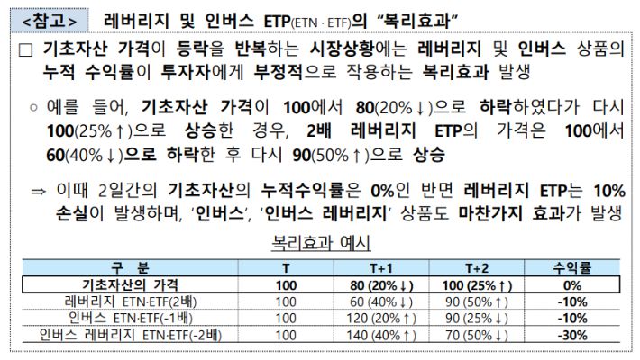 이어 "레버리지와 인버스 ETP 수익률은 투자손실이 단기간에 크게 확대될 수 있다"며 "특히 누적수익률이 기초자산 수익률보다 낮아지는 복리효과도 발생한다"고 유의를 당부했다.