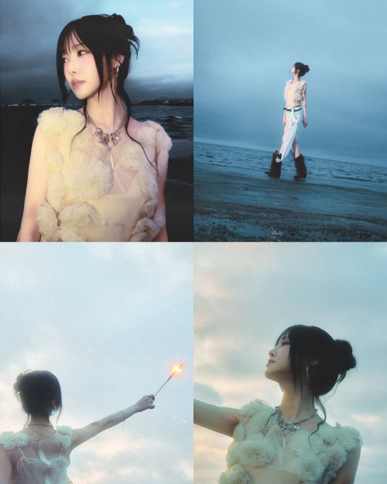 또 다른 이미지에서 유주는 바다를 거닐며 감각적인 비주얼을 완성했다. 그는 꽃 장식이 돋보이는 스타일링을 소화하며 앨범 콘셉트를 고스란히 담아낸 것은 물론, 불꽃놀이를 하는 모습으로 독보적인 감성까지 극대화했다.