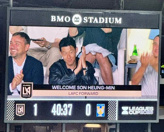 이날 손흥민은 LAFC와 티그레스(멕시코)의 북중미 리그스컵 경기가 열린 LA BMO 스타디움에 모습을 드러냈다. 구단 관계자와 VIP석에서 경기를 지켜보던 손흥민은 LAFC가 골을 넣자 손뼉을 쳤다. LAFC 구단이 경기장 전광판에 손흥민을 비추며 ‘웰컴. LFAC 포워드(FORWARD)’라는 영문 자막을 내보냈다. 팬들은 큰 환호성으로 반겼다.