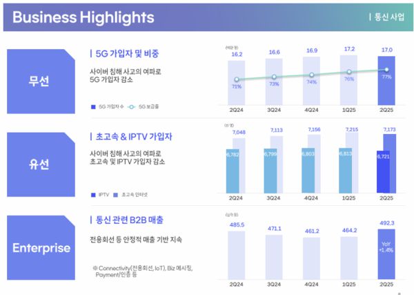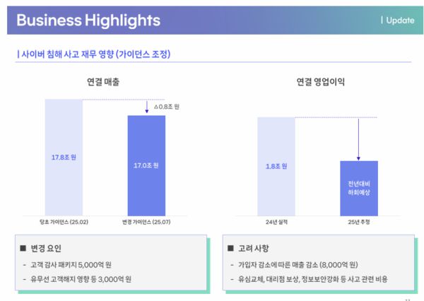 김 CFO는 "하반기 해킹 보상 대응 비용은 상반기보다 더 불어날 것"이라며 "8월 전체 고객 요금 50% 할인과 멤버십 혜택 강화 등은 3분기와 4분기에 걸쳐 반영한다"라고 설명했다.