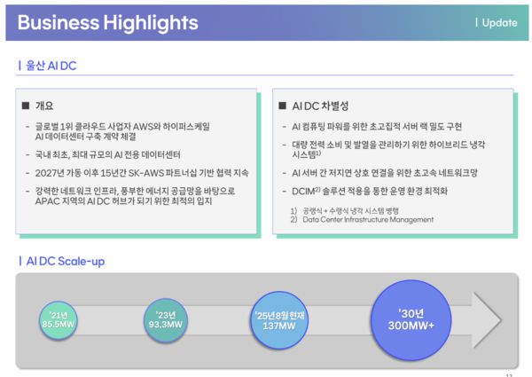이현우 SK텔레콤 AIDC추진본부장은 "울산 AIDC는 SK브로드밴드가 DC 설계 및 구축 투자를 AWS가 GPU 확보 등 컴퓨팅 투자를 진행한다"라며 "울산 AIDC 포함 2030년까지 총 300메가와트(MW) 용량을 확보하면 AIDC로만 연간 1조원 이상 매출을 기대할 수 있다"라고 분석했다.