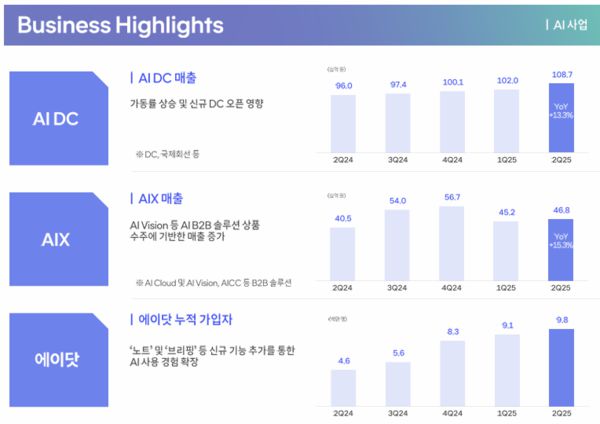 인공지능(AI) 사업은 궤도에 올랐다. AI 데이터센터(DC) 매출액은 1조0870억원 AI 전환(AIX) 매출액은 4680억원이다. AIDC는 전기대비 6.6% 전년동기대비 13.3% 확장했다. AIX는 전기대비 3.5% 전년동기대비 15.3% 팽창했다. AI 에이전트 '에이닷' 가입자는 980만명이다. 전기대비 70만명 전년동기대비 520만명 더 들어왔다.