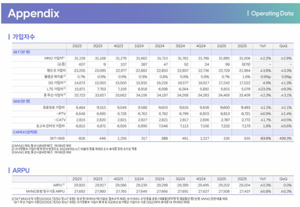 한편 SK텔레콤은 지난 25일 2분기 분기 배당으로 주당 830원을 공시했다. 시가배당율은 1.5%다. 배당기준일은 오는 31일이다. 배당금 지급일은 9월17일이다. 지난 1분기 분기 배당과 같은 액수다. SK텔레콤은 지난 1분기 컨퍼런스콜에서 해킹 사고에도 불구 배당을 유지하겠다고 확언했다. 그러나 이날 컨퍼런스콜에서는 분위기가 조금 변했다.