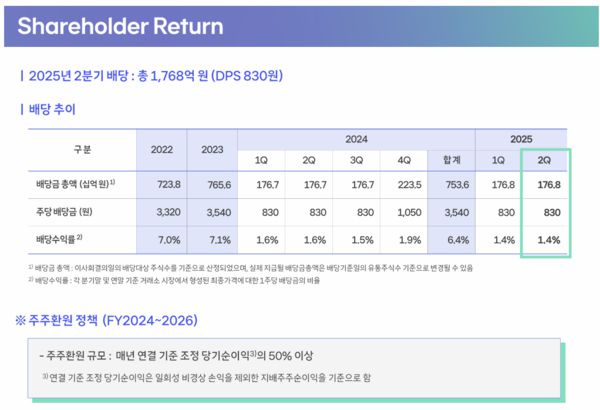 김 CFO는 "매출 가이던스를 하향 조정했고 이익도 전년대비 큰폭으로 감소가 예상돼 주주환원에 고민이 있는 것은 사실이다"라며 "다양한 요소를 충분히 숙고해 올해 배당 규모를 결정할 예정으로 고객 신뢰를 회복하고자 하는 것처럼 주주 신뢰 역시 SK텔레콤이 무엇보다 중요하게 생각하는 가치"라고 말을 흐렸다.