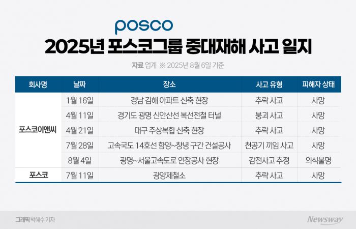 포스코이앤씨는 ▲1월16일 경남 김해 아파트 신축 현장 추락사고 ▲4월11일 경기도 광명 신안산선 복선전철 터널 건설현장 붕괴사고 ▲4월21일 대구 주상복합 신축현장 추락사고 ▲지난달 28일 고속국도 14호선 함양~창녕 구간 건설공사 천공기 끼임사고 등으로 각각 사망자가 발생했다.