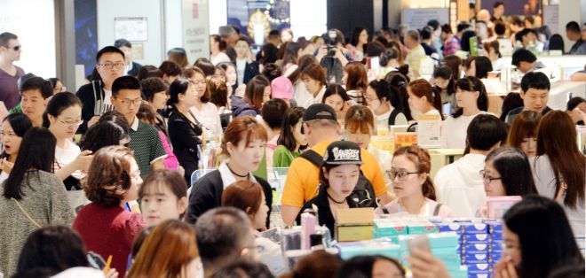 과거서울 중구 롯데백화점 면세점 화장품 코너가 중국 노동절 및 일본골든위크를 맞아 한국을 찾은 중국인 관광객(유커) 및 일본관광객들로 북적이던 모습. 서울신문 DB |