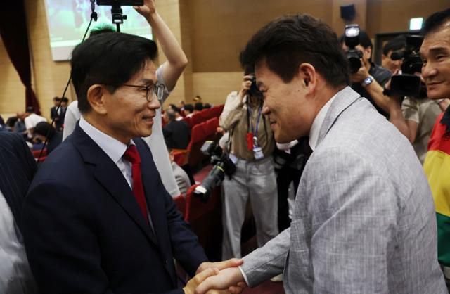 국민의힘 당권주자인 김문수(왼쪽) 전 고용노동부 장관이 지난 4일 국회 의원회관에서 열린 투게더포럼 시국 토론회 '투쟁이 혁신이다'에 참석해 한국사 강사 전한길씨와 인사하고 있다. 뉴시스