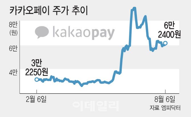 6일 엠피닥터에 따르면 카카오페이는 전 거래일보다 0.97%(600원) 오른 6만 2400원에 거래를 마쳤다. 사흘 연속 오름세지만 지난 1일(-5.15%) 급락분을 만회하기에는 부족하다. 특히 전날 2분기 호실적을 발표했음에도 주가는 크게 반응하지 않았다.
