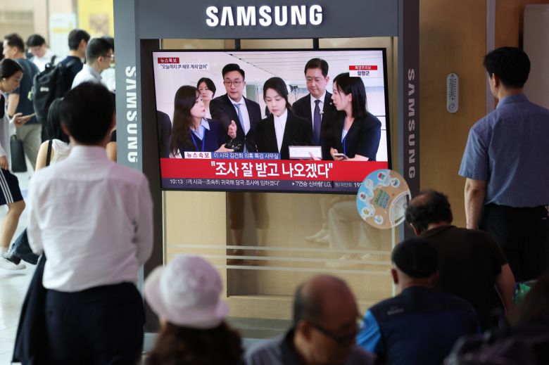 6일 서울역에서 시민들이 윤석열 전 대통령의 부인 김건희 여사가 각종 의혹 조사를 받기 위해 민중기 특별검사팀에 피의자 신분으로 출석하는 모습을 방송으로 보고 있다.  /연합